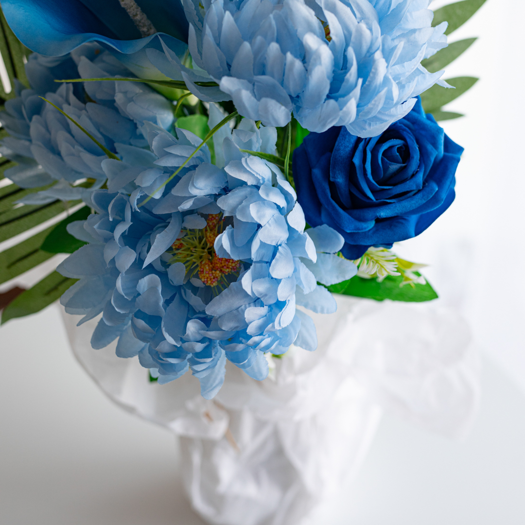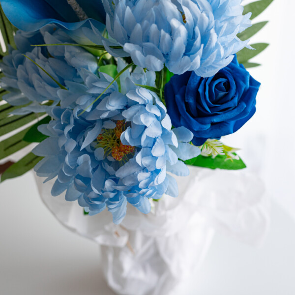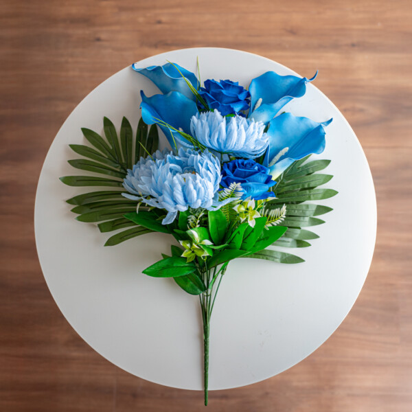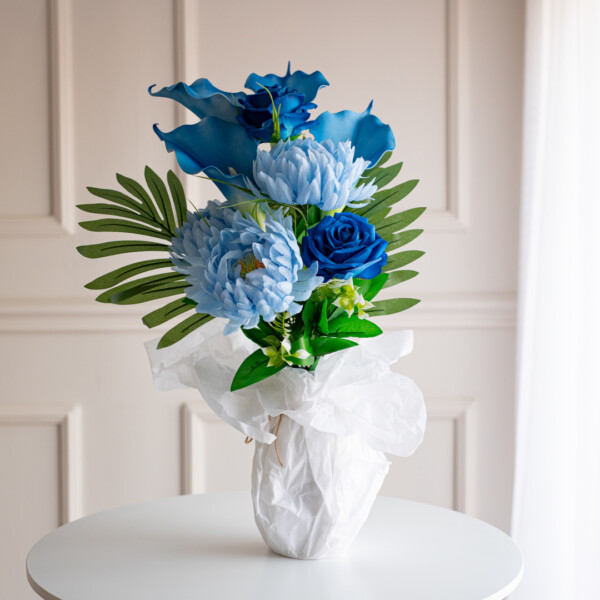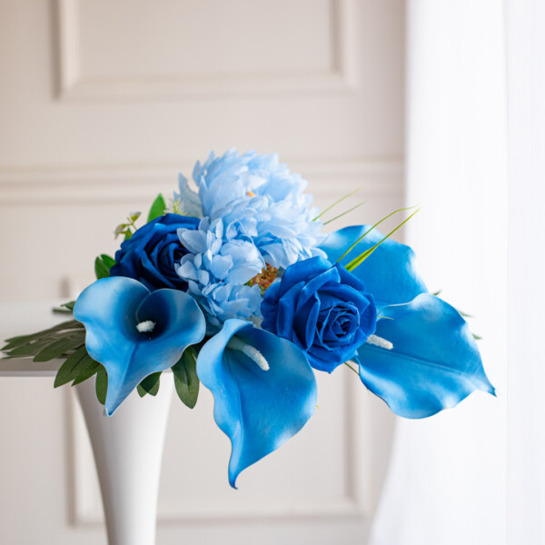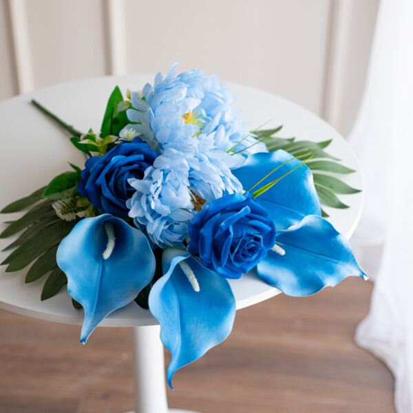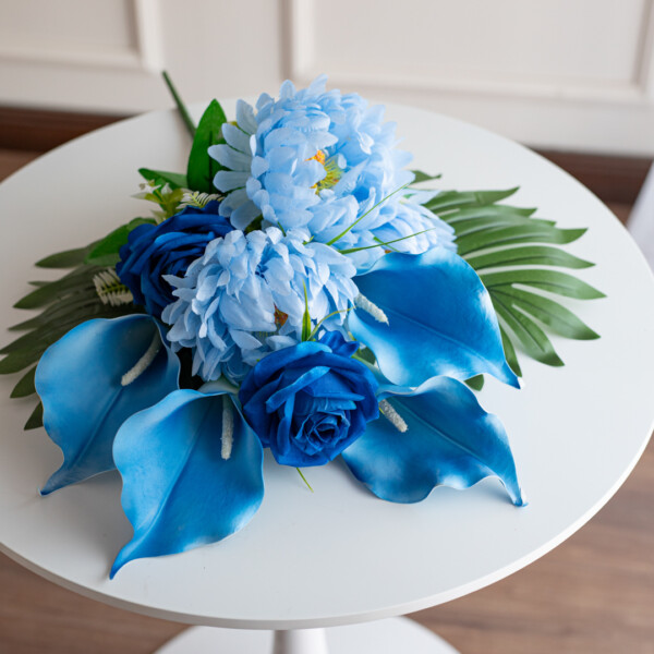 Штучний букет синіх кал , троянд і хризантем — елегантна композиція для створення витонченої атмосфери в будь-якому інтер’єрі. Насичені кольори та реалістичні деталі роблять його чудовим декоративним акцентом, який не потребує догляду.