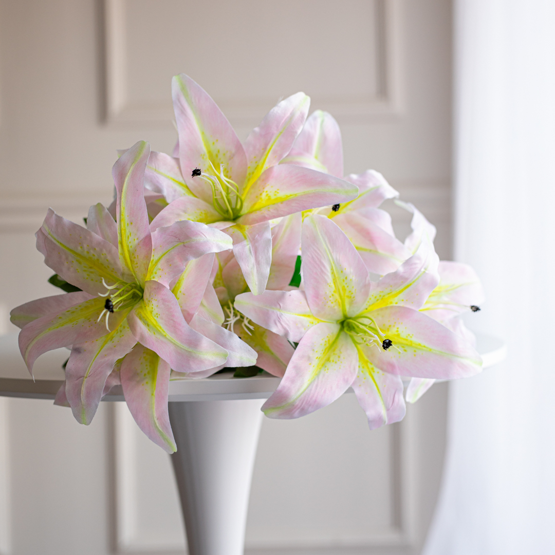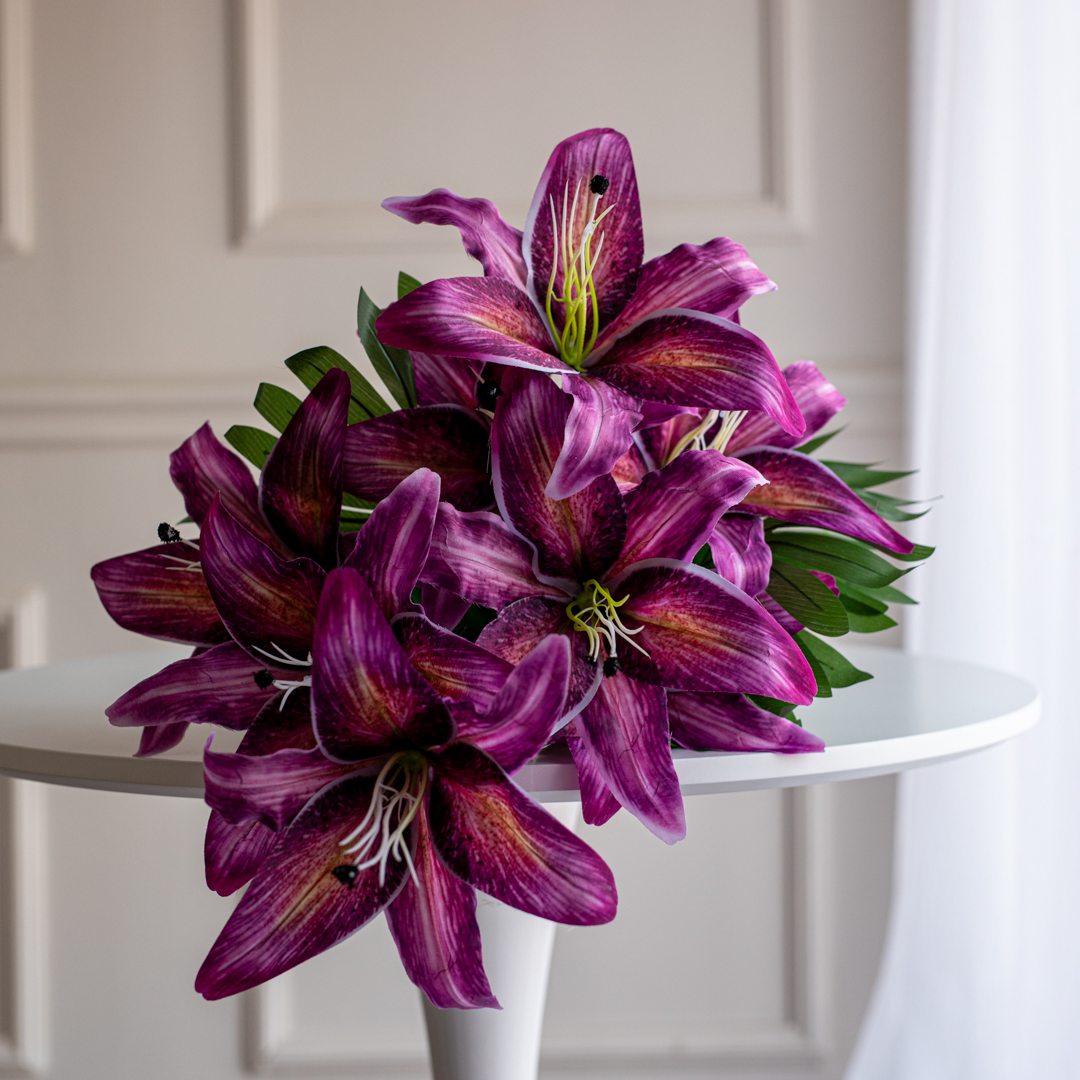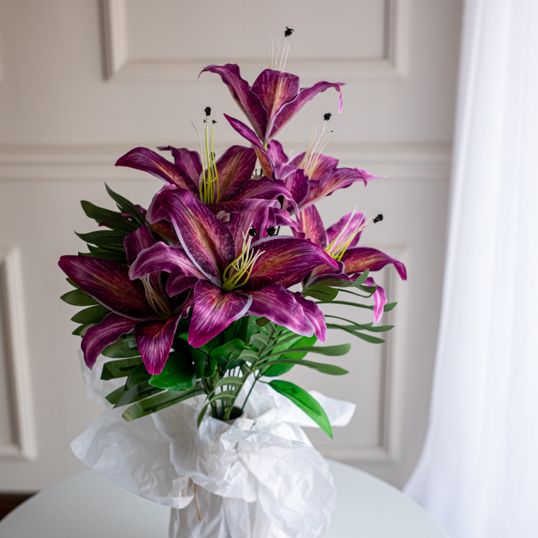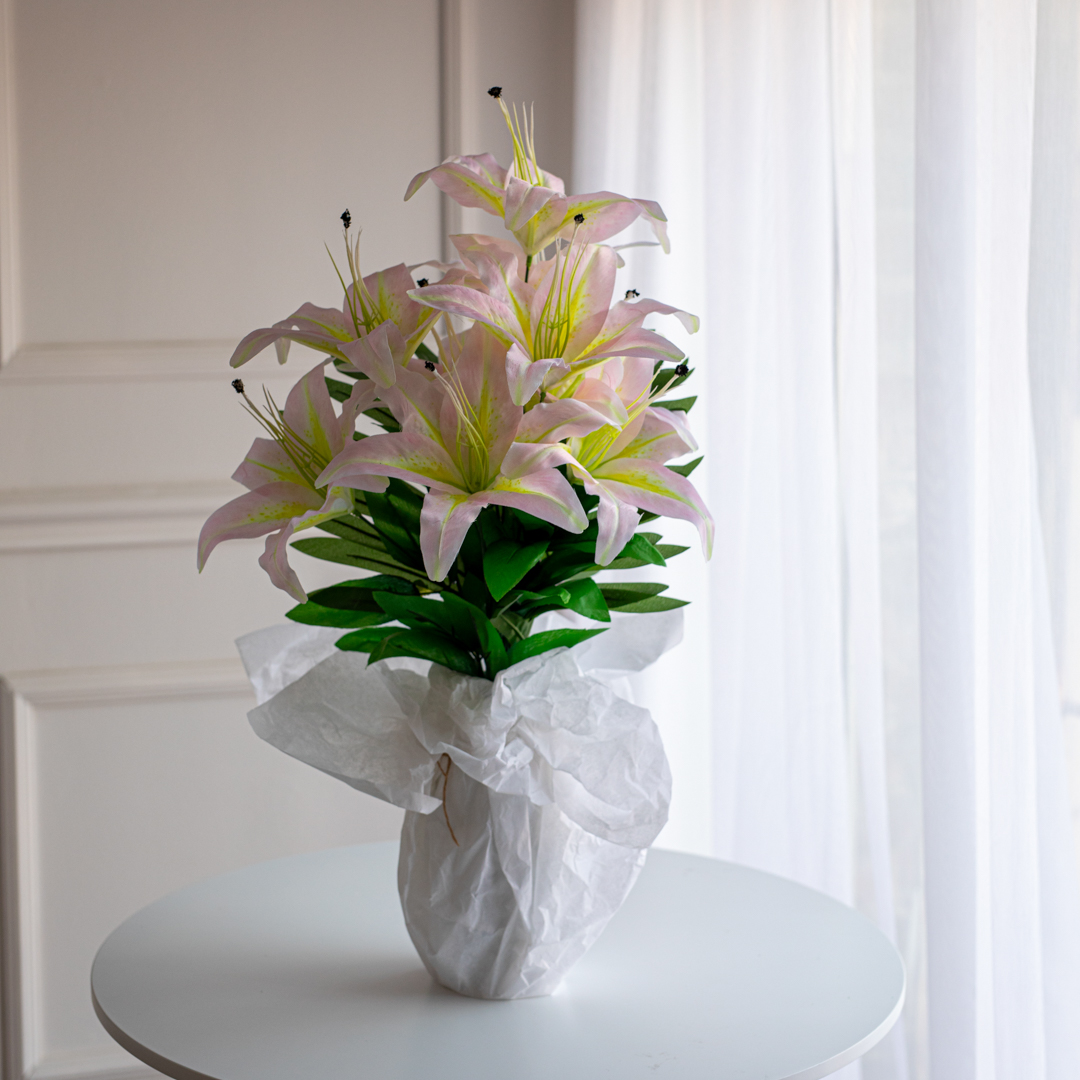 Штучний букет лілій у варіативних відтінках — ніжна та вишукана композиція для будь-якого інтер’єру. Реалістичні пелюстки і насичені кольори створюють атмосферу елегантності та спокою, при цьому не потребуючи догляду.