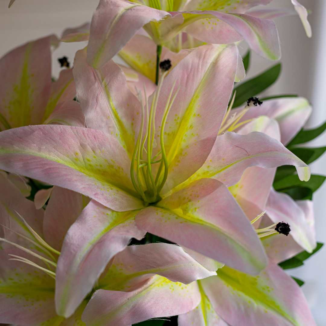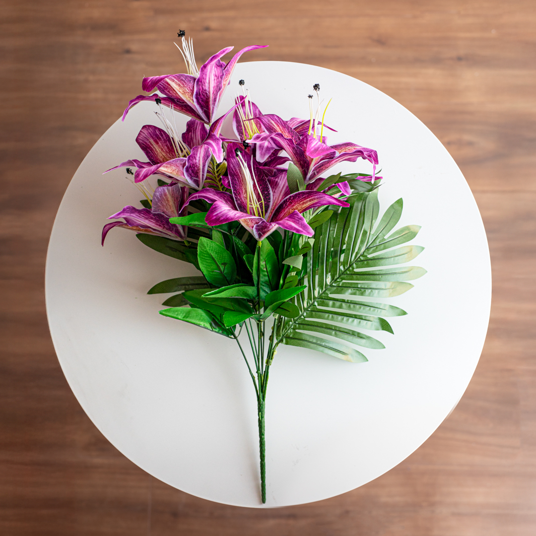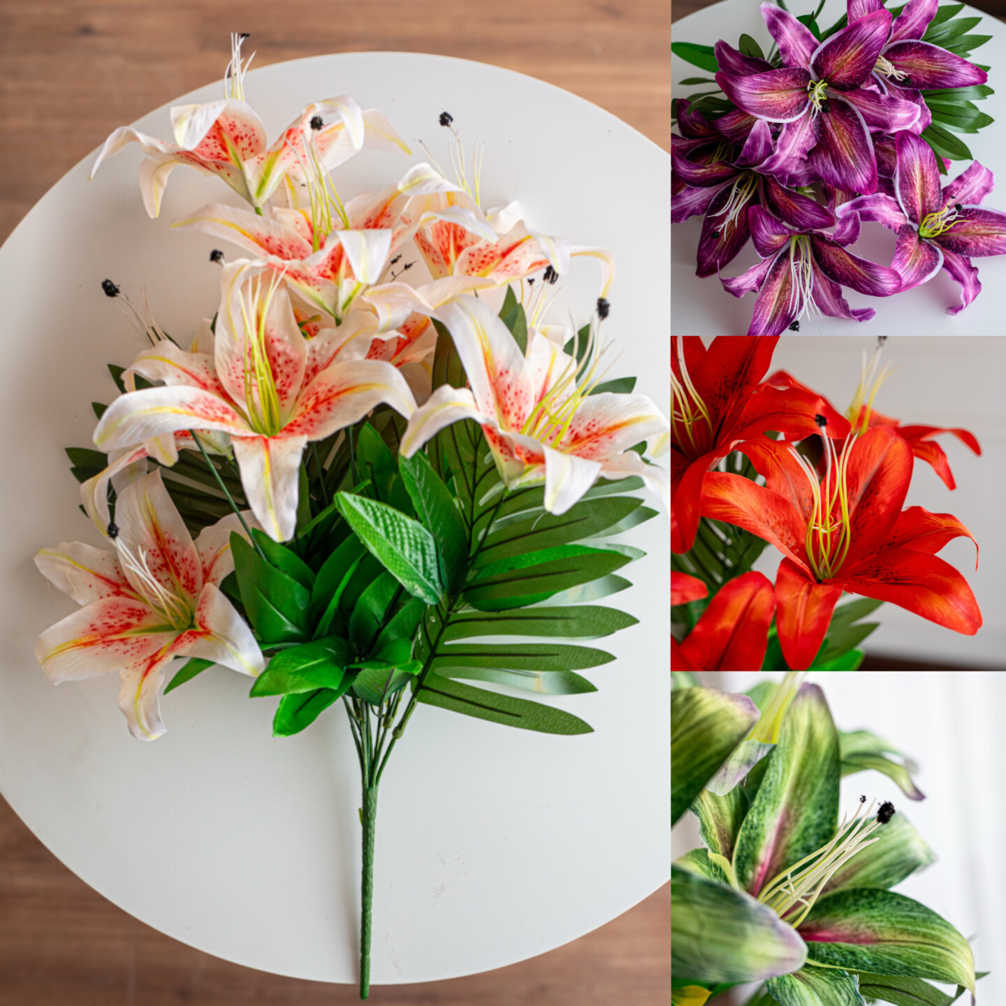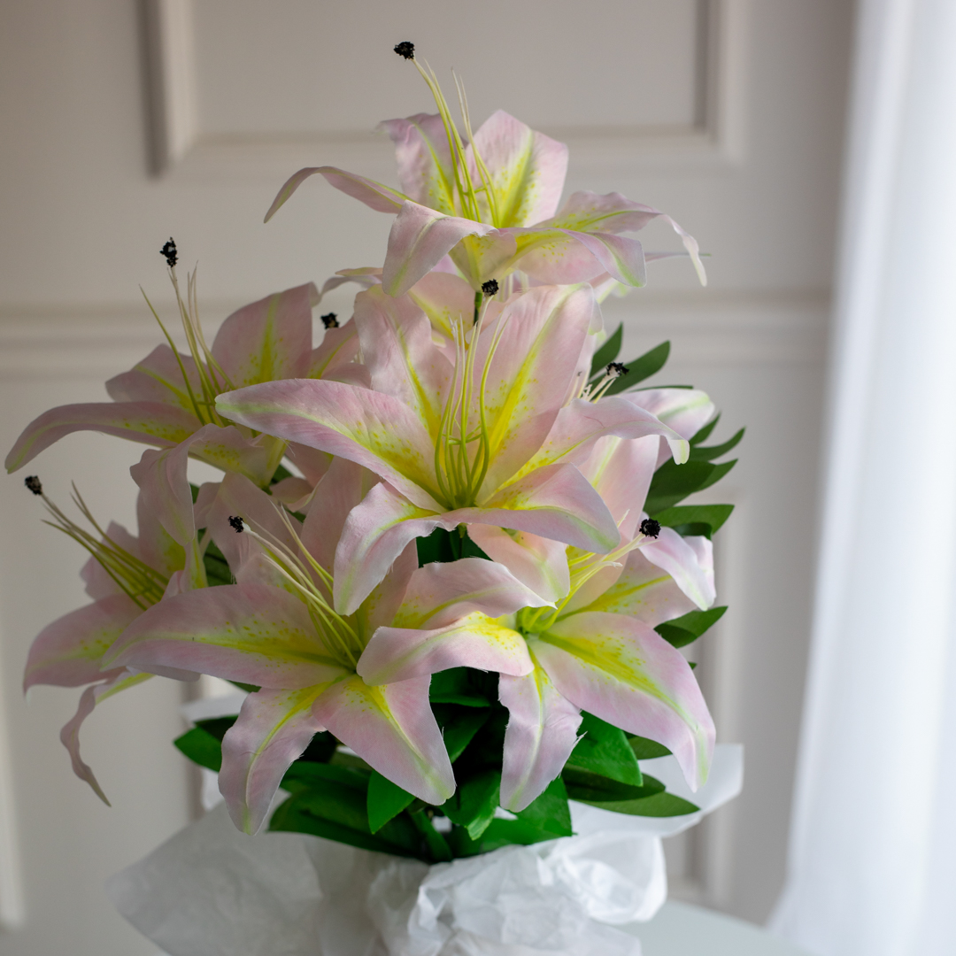 Штучний букет лілій у варіативних відтінках — ніжна та вишукана композиція для будь-якого інтер’єру. Реалістичні пелюстки і насичені кольори створюють атмосферу елегантності та спокою, при цьому не потребуючи догляду.
